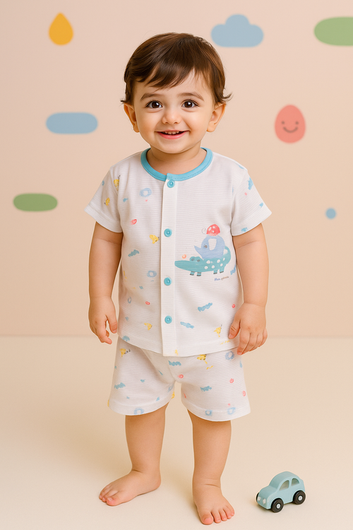 این محصول از جنس نخ ۱۰۰٪ طبیعی ساخته شده که لطیف، نرم و مناسب فصل بهار و تابستان است، بنابراین کودک شما در طول روز احساس آسایش و آزادی حرکت خواهد داشت.