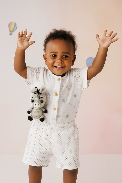 این محصول از جنس نخ ۱۰۰٪ طبیعی ساخته شده و شلوارک از جنس کتان است که لطیف، نرم و مناسب فصل بهار و تابستان است، بنابراین کودک شما در طول روز احساس آسایش و آزادی حرکت خواهد داشت.